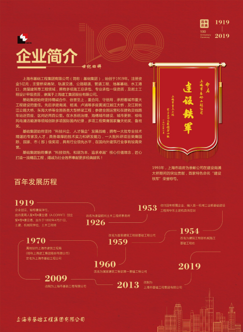 9、企业简介:上海市基础工程集团有限公司(原上海市基础工程公司、上海市基础工程有限公司,简称:基础集团),始创于1919年。注册资金8亿元,主营桥梁高架、轨道交通、公路隧道、管道工程、深基础工程、水工港口、房屋建筑等工程领域,拥有多项施工总承包、专业承包一级资质,及岩土工程设计甲级资质,隶属于上海建工集团股份有限公司,被上海市政府特色命名为“建设铁军”。